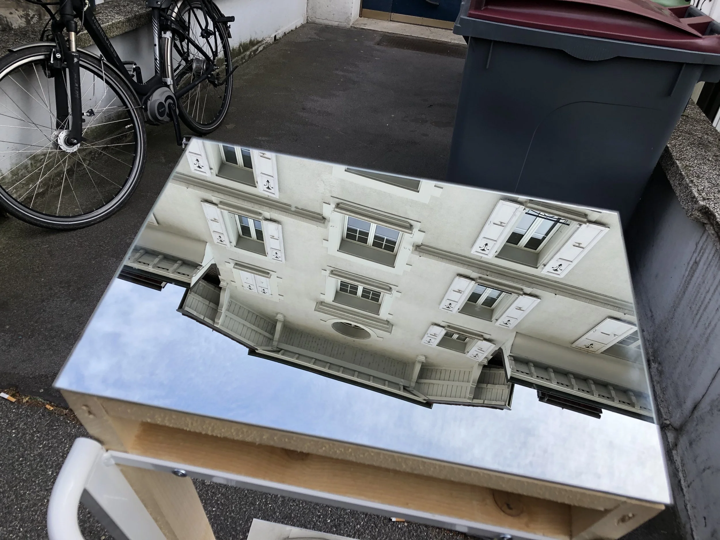 “J’ai trouvé cette expérience incroyable. Au départ, étant réticente, j’ai eu envie d’aller dans la nature, en forêt, car l’idée de me promener avec le Skywatcher 2 en ville me gênait. De fait, très rapidement, après quelques dizaines de pas, j’ai oublié les gens et leur regard. C’est vraiment un objet urbain. Dans la nature, avec les roues sur des chemins sinueux, ça n’aurait pas fonctionné. J’ai réalisé une série de photographies architecturales en me positionnant de l’autre côté du dispositif à l’arrêt et en jouant avec l’image réelle à l’endroit et l’image reflétée à l’envers dans une seule prise de vue.” Valérie, 2 juin 2021